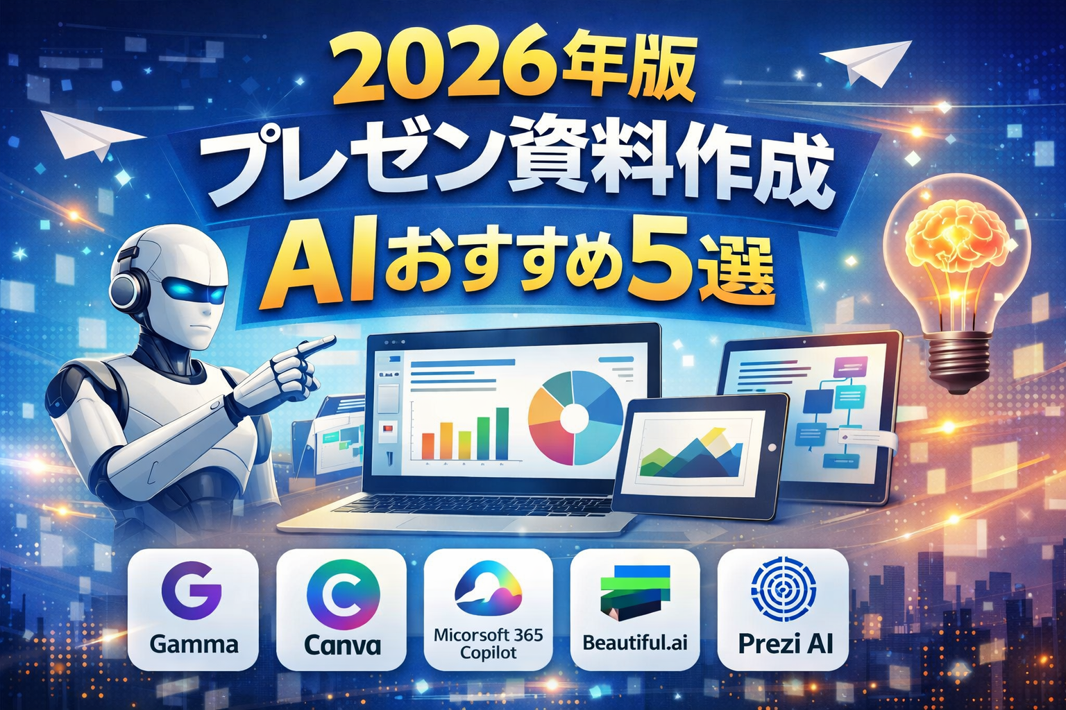 プレゼン資料を効率よく作成したい方にとって、AIツールはかなり実用的な選択肢になっています。現在は、テキストからそのままスライドのたたき台を作れるもの、既存の文章や資料をもとに構成を整えられるもの、デザインや発表の見栄えまで含めて整えやすいものなど、役割がかなり分かれてきています。この記事では、2026年時点で使いやすい主要サービスを5つに絞って、始めやすさ、使いやすさ、実用性を軸にご紹介します。