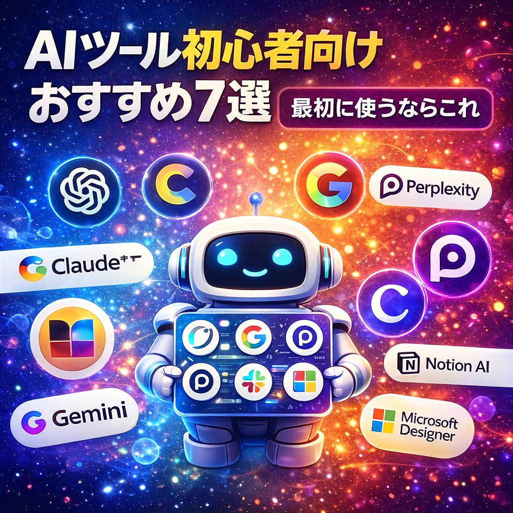 初心者向けAIツールおすすめ7選としては、ChatGPT、Claude、Gemini、Perplexity、Canva、Notion AI、Microsoft Designerがかなり入りやすい候補です。最初の1本で迷うなら、幅広く試せるChatGPTが無難です。文章中心ならClaude、Google環境ならGemini、調べ物ならPerplexity、デザインならCanvaやMicrosoft Designer、整理と併用するならNotion AIを選ぶといいでしょう。最初から完璧を狙わず、使いながら相性を見るのが一番早いです。