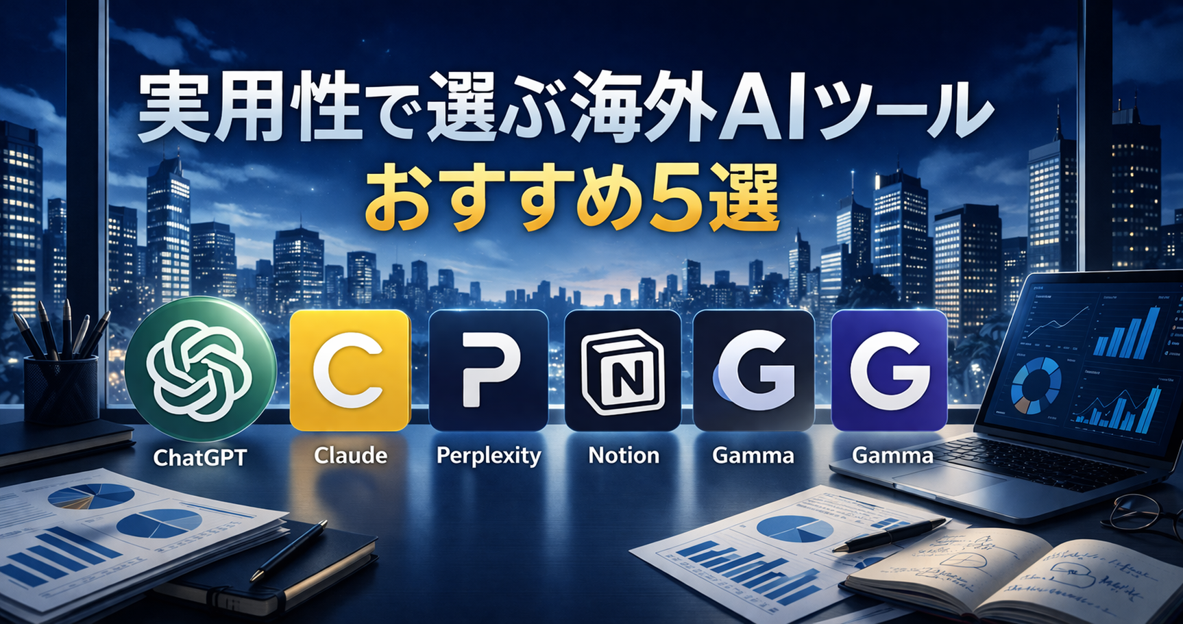 海外AIツールは数が多いですが、実際に使いやすいものはある程度絞れます。2026年時点で実用性を重視するなら、単に話題だからではなく、日常業務にそのまま入れやすいか、下書きや調査の時間を減らせるか、資料や情報整理までつなげやすいかで選ぶのが大事です。今回はその観点で、ChatGPT、Claude、Perplexity、Notion AI、Gammaの5つをおすすめとして整理します。