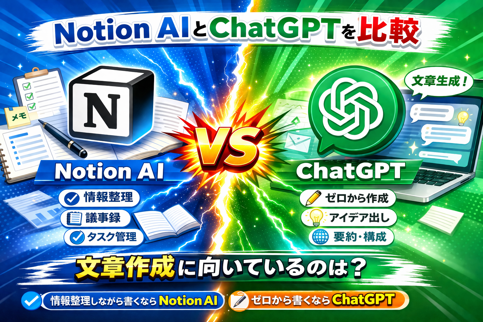 この比較をまとめると、情報整理と一緒に書くならNotion AI、ゼロから文章を作るならChatGPTが分かりやすいです。